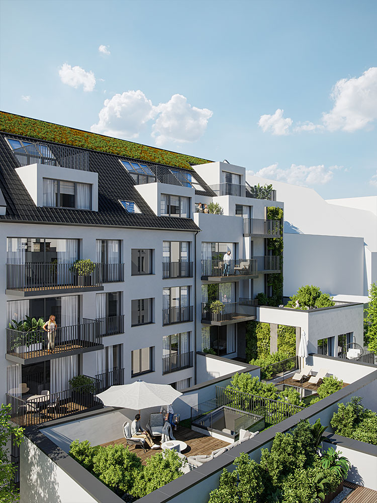 Cornelius City Living ist ein anspruchsvolles Bauprojekt, das lebenswerten Wohnraum im Herzen der Düsseldorfer City schafft. Die historischen Gebäude in der Corneliusstraße werden kernsaniert, auf den Rohbau zurückgebaut und in neuwertige Wohnungen mit grünen Flachdächern und großzügigen (Dach-) Terrassen verwandelt.