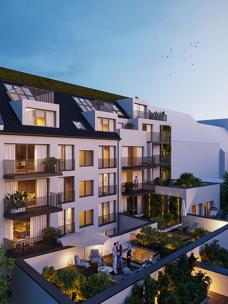 In den 20 Eigentumswohnungen erleben Sie eine Symbiose aus gehobener Ausstattung und Geborgenheit. Moderne Schnitte mit offenen Küchen und großen Räumen werden durch harmonische Formen und Farben, sowie unseren hochwertigen Eichenparkettboden ab-gerundet. Das sorgfältig durchdachte Design setzt den idealen Rahmen für Ihre individuellen Gestaltungsideen. Großzügige Balkone und Terrassen verwandeln Ihre Wohnung im Sommer zu einem echten Lebenstraum. Freuen Sie sich auf das Gefühl, die warme Abendluft einzuatmen, während sich die letzten Sonnenstrahlen über Düsseldorf legen.